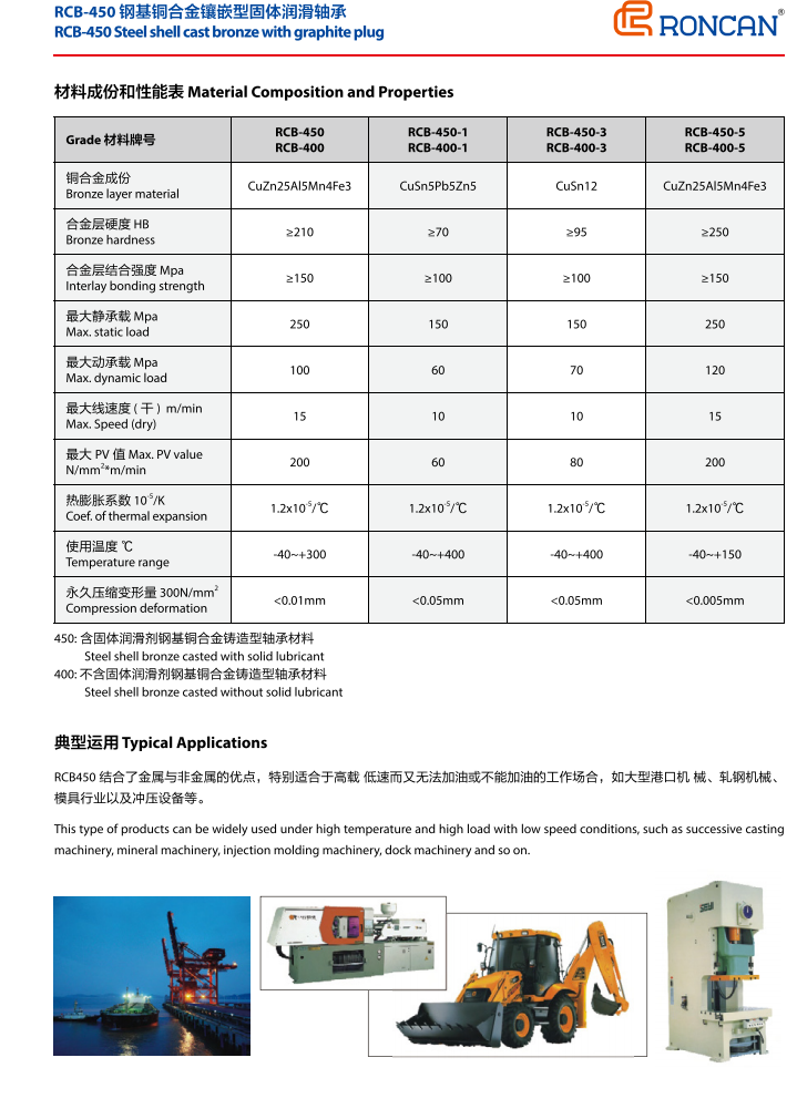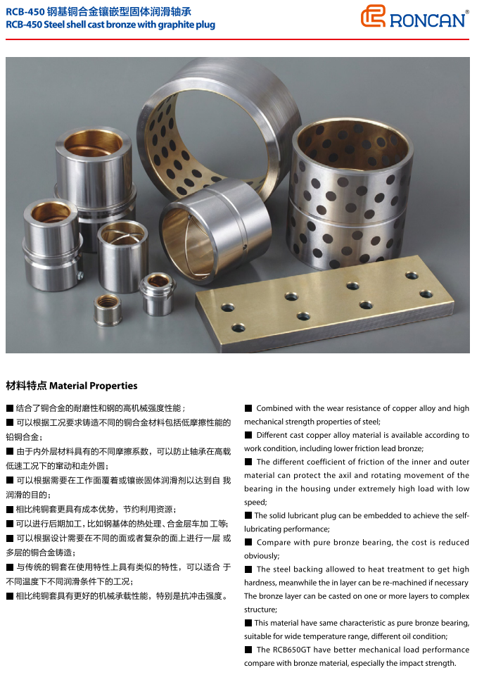RCB450結(jié)合了金屬與非金屬的優(yōu)點,特別適合于高載低速而又無法加油或不能加油的工作場合,如大型港口機械、軋鋼機械、模具行業(yè)以及沖壓設備等。